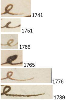 - round <e> is always used, never secretary or epsilon <e>. In more cursive writing, the eye of the loop is tighter and sometimes squinted so the <e> resembles <c> (1765 the first <e> of ‘however’ l. 4, ‘great’ l. 13), this squinted form being rarer in his less fluently-penned late letters that prefer rounded loops (1789 ‘late’ l. 3, ‘gives’ l. 12).
