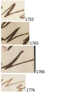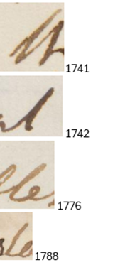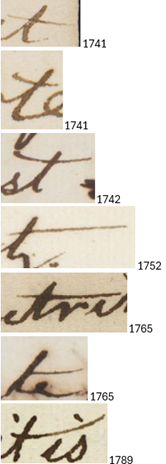 - <t> is most frequently written with a crossbar and the styles of crossbar show variation in length, position, curve, taper, and pressure. In addition to this form, all three of these autograph letters by Smith feature some forms of <t> with no crossbar (1741 ‘there’ l. 5, ‘taken’ l. 9, and in the subscription ‘Mother’; 1765 ‘dissipated’ l. 13; 1789 ‘the’ l. 7, ‘their’ l. 16). In the more cursively written letter from 1765, Smith regularly used the form of <t> with an attached upstroke with no pen-lift, typically where <t> is in the terminal position (1765 ‘it’ l. 2, ‘present’ l. 4, ‘at’ l. 5, ‘great’ l. 13).