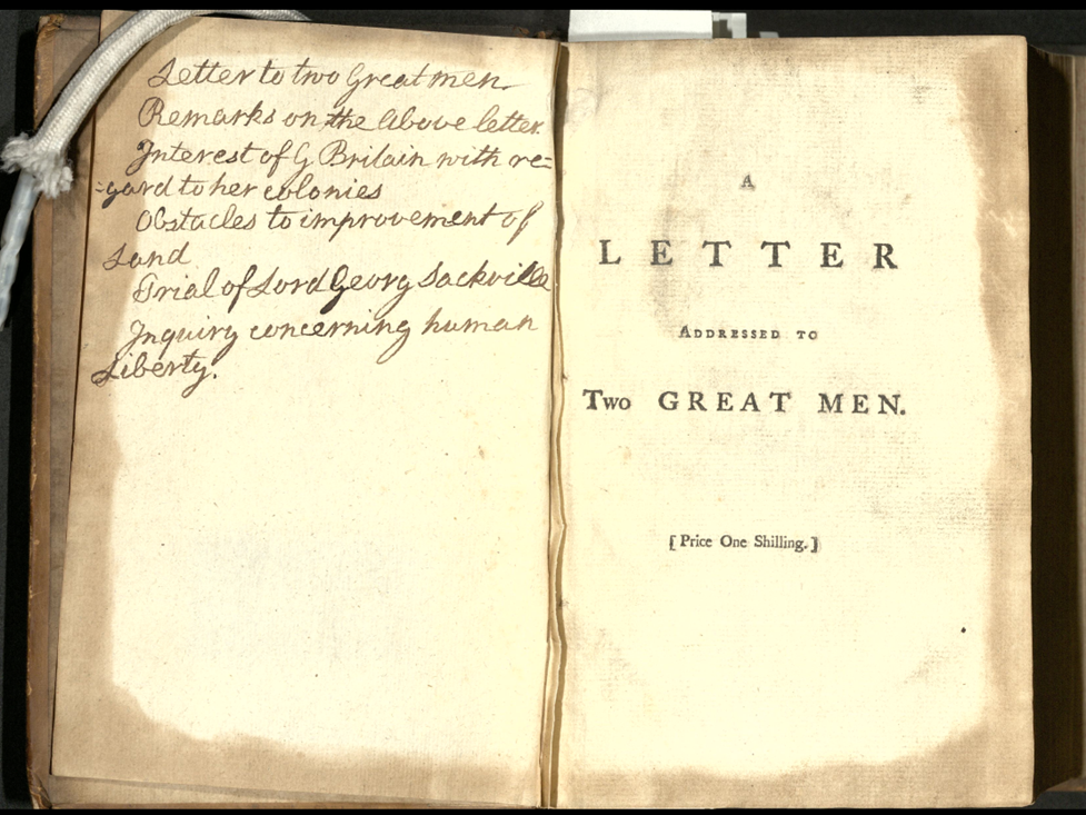 These features in combination with one another, taking into account their frequency and distribution, and in the context of the features of duct and aspect, align with expectations of Smith’s hand. The quality of the sample and clarity of the match allow for confident attribution of this contents list to Smith. Further, the same process of authentication by matching with the reference profile confirms that Smith penned the contents lists handwritten in 10 more bound volumes: ‘Tracts on Grain Trade’, ‘Consideration on Money, Bullion, &c, &c, &c', ‘Price on Civil Liberty &c.’, ‘Dupleix’, ‘State of the nation 1760s-70s’, ‘Tucker’s tracts’, ‘Public Affairs’, ‘Political Pamphlets’, ‘Pamphlets’, and ‘Recherches sur la population’ (another volume of ‘Pamphlets’ and the volume titled ‘Charity’ have similar contents lists but these are written in other hands, perhaps by librarians or later owners). The variations in style between these contents lists suggests they were added by Smith at different points in time, i.e. after the topical pamphlets were assembled, rather than all together at a later point. They give us Smith at work, pen in hand, in his library.