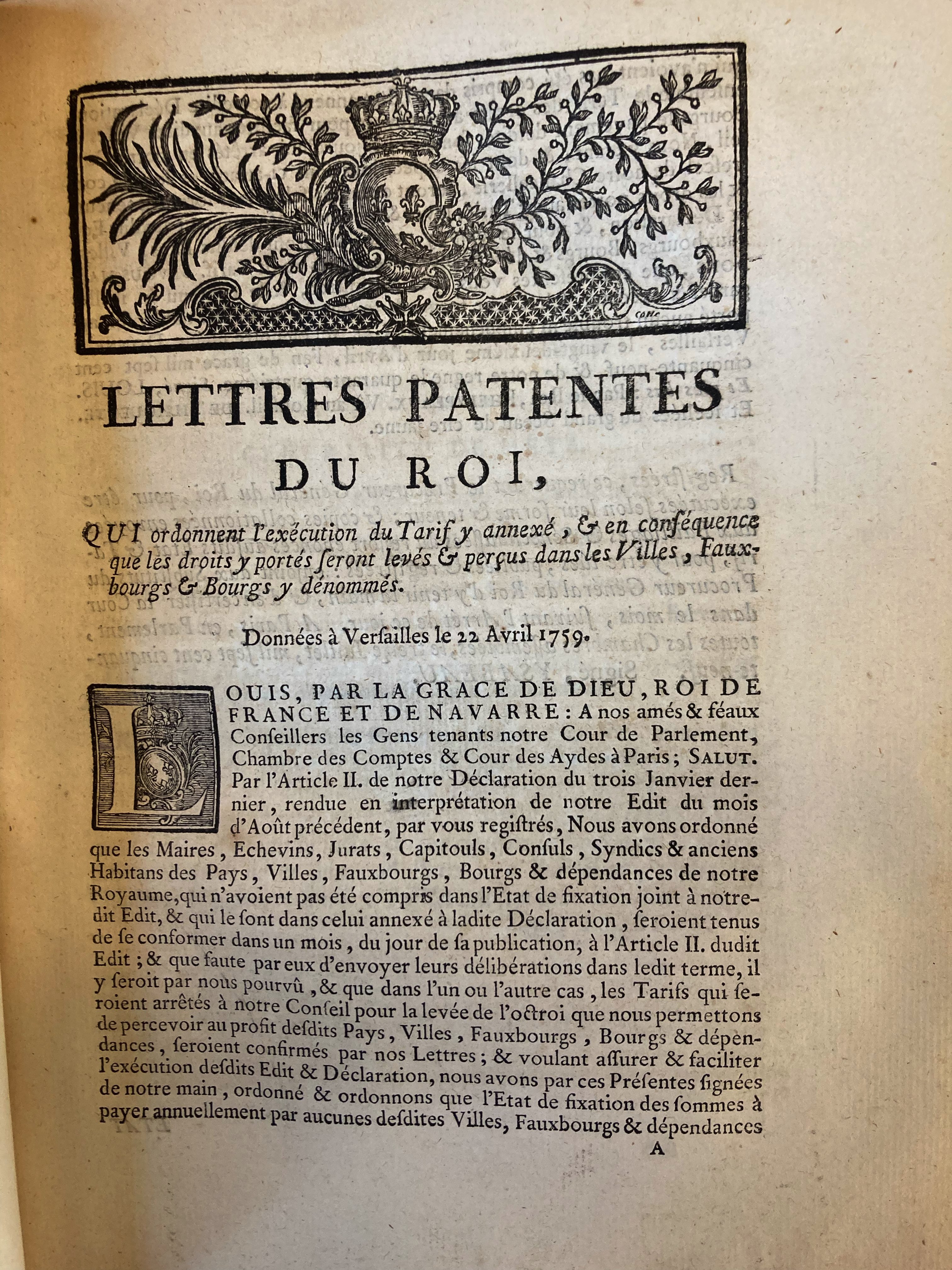 | Title | Lettres patentes du roi, qui ordonnent l'exécution du tarif annexé, & en conséquence que les droits y portés seront levés perçus dans les villes, fauxbourgs y dénommés |
