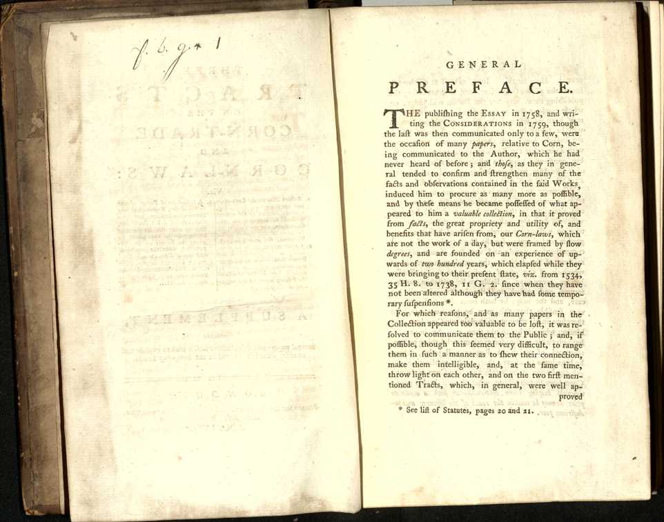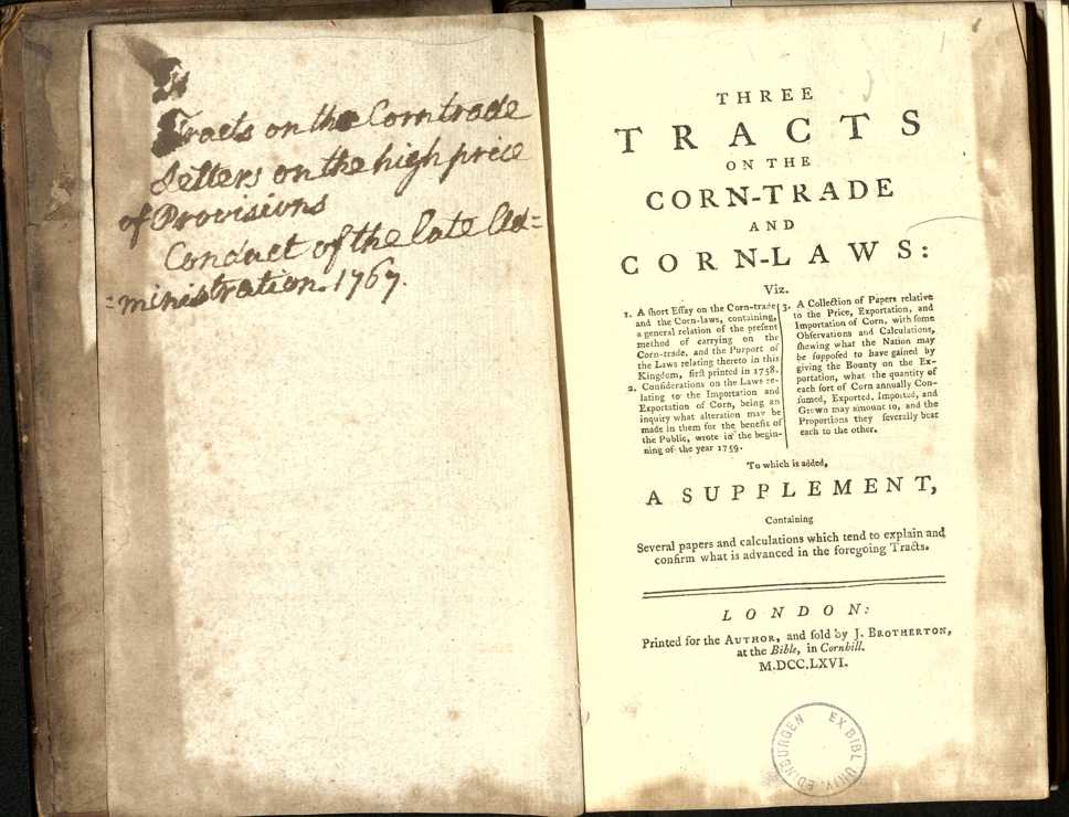 Three tracts on the corn-trade and corn-laws : Viz. 1. A short Essay on the Corn-Trade and the Corn-Laws, containing, a general relation of the present method of carrying on the Corn-Trade, and the Purport of the Laws relating thereto in this Kingdom, first printed in 1758. 2. Considerations on the Laws relating to the Importation and Exportation of Corn, being an inquiry what alteration may be made in them for the benefit of the Public, wrote in the beginning of the year 1759. 3. A Collection of Papers relative to the Price, Exportation, and Importation of Corn, with some Observations and Calculations, shewing what the Nation may be supposed to have gained by giving the Bounty on the Exportation, what the quantity of each sort of Corn annually Consumed, Exported, Imported, and Grown may amount to, and the Proportions they severally bear each to the other : to which is added, a supplement, containing several papers and calculations which tend to explain and confirm what is advanced in the foregoing tracts |