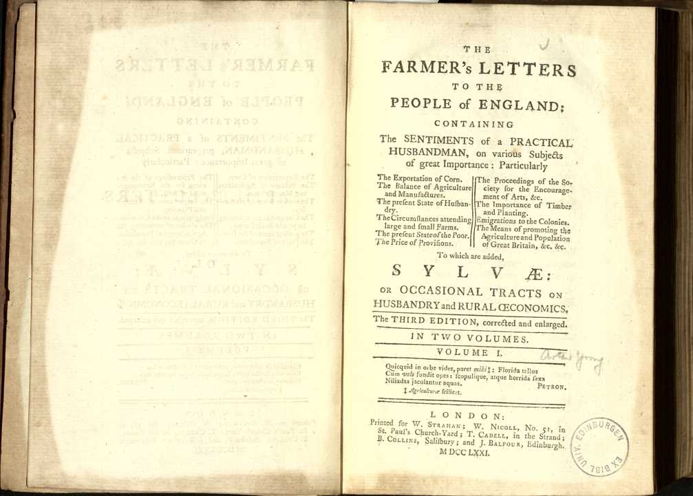 | Title | The farmer's letters to the people of England : containing the sentiments of a practical husbandman, on various subjects of great importance, particularly: the exportation of corn. The balance of agriculture and manufactures. The present state of husbandry. The circumstances attending large and small farms. The present state of the poor. The price of provisions. The proceedings of the society for the encouragement of arts, &c. The importance of timber and planting. Emigrations to the colonies. The means of promoting the agriculture and population of Great Britain, &c., &c. : To which are added, Sylvae, or occasional tracts on husbandry and rural oeconomics |
