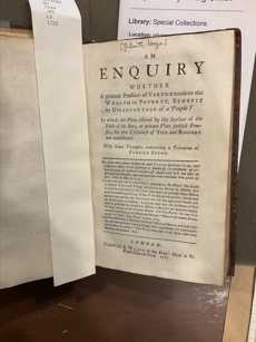 | Title | An enquiry whether a general practice of virtue tends to the wealth or poverty, benefit or disadvantage of a people?: in which the pleas offered by the author of The fable of the bees … are considered : with some thoughts concerning a toleration of publick stews. |